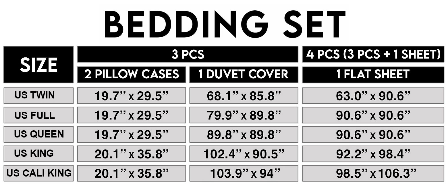 - 4PCS: 1 Duvet Cover (two-sided printing) and 2 Pillowcases, 1 Sheet Cover.